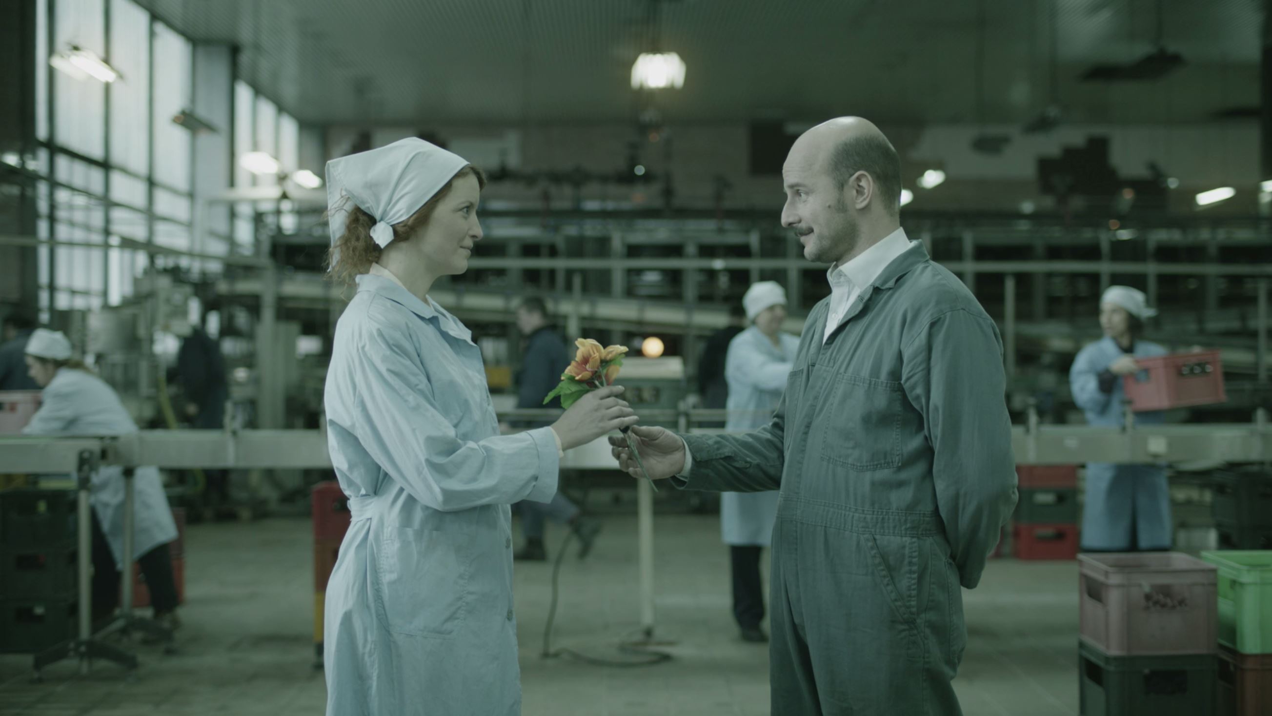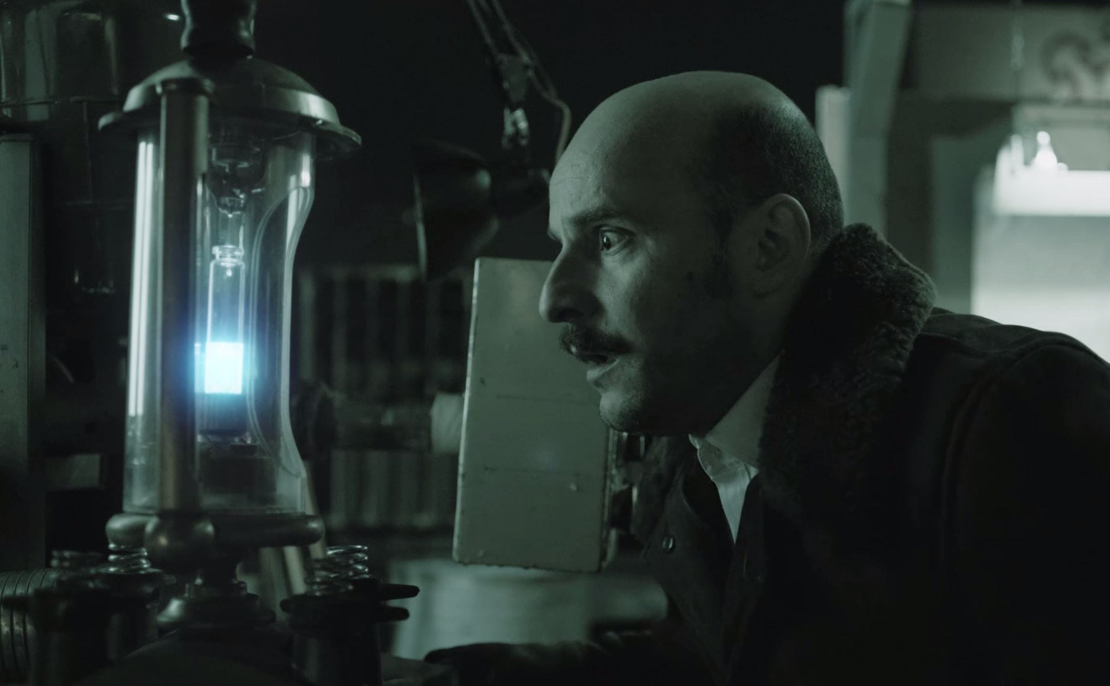 A factory worker assembles an enigmatic machine that produces liquid drops from the moonlight.
